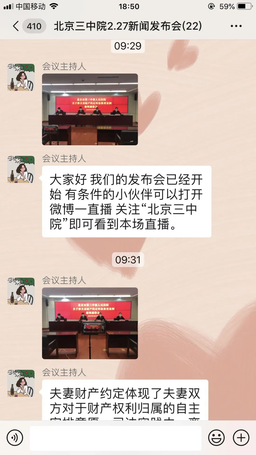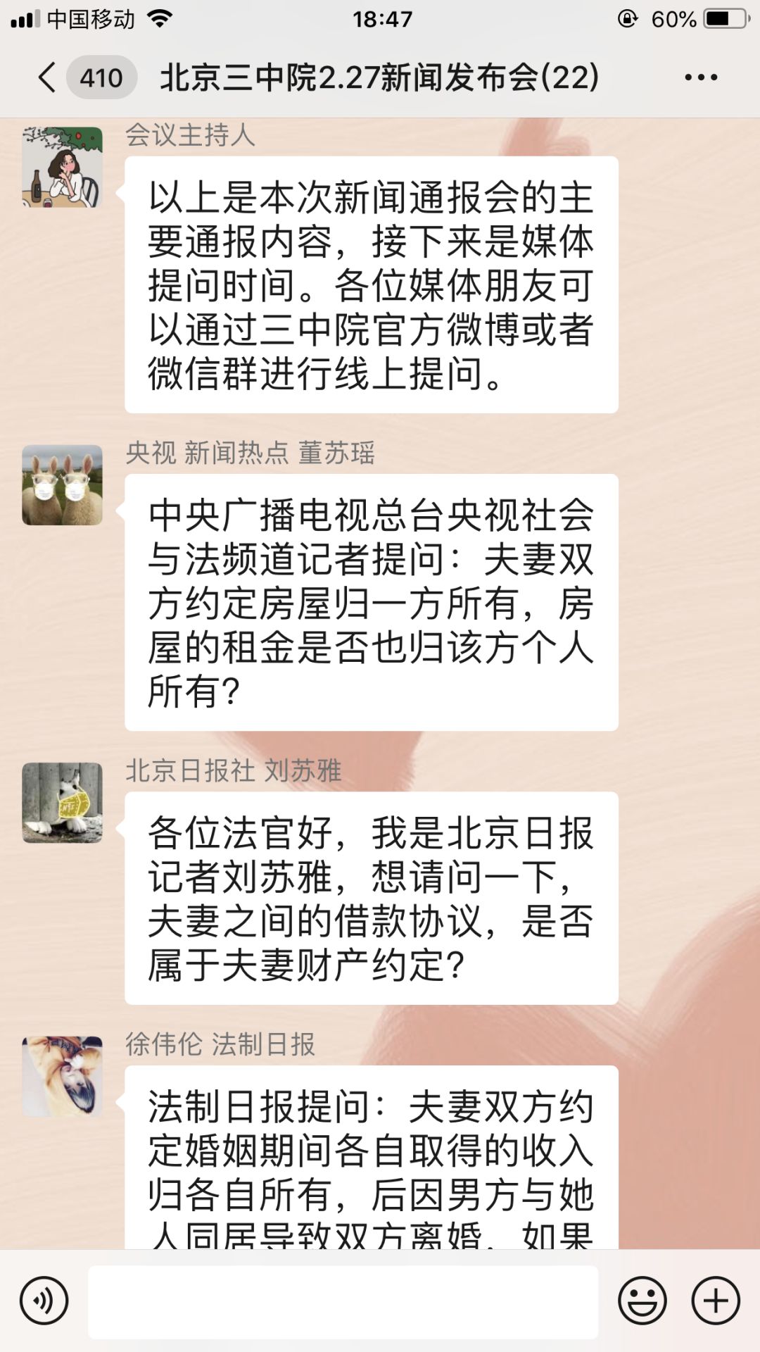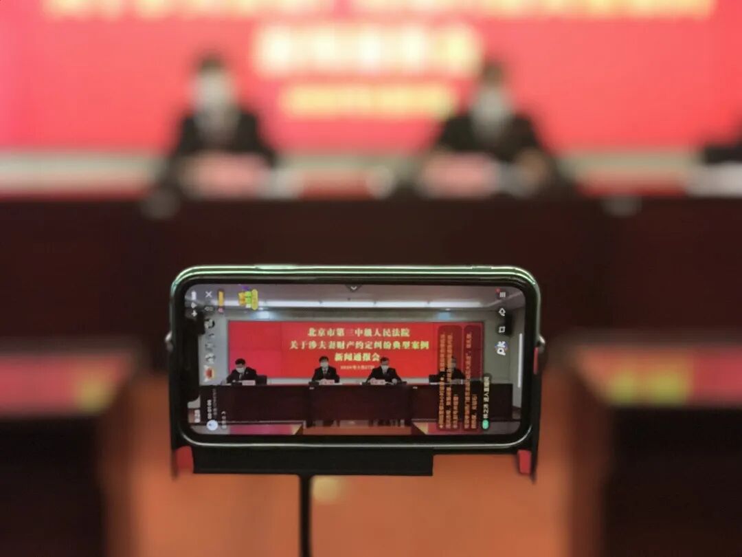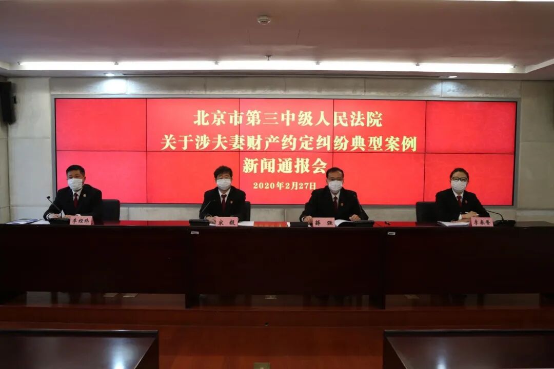 2月27日,@北京三中院通过新浪微博平台召开线上新闻通报会,对涉夫妻财产约定纠纷典型案例进行了通报,同时通过微信同步向来自中央电视台、法制日报、经济日报、中国妇女报、中央广播电台、北京日报、北京青年报、民主与法制时报、新京报等16家媒体的记者们进行线上图文直播。部分人大代表和网友共同在线观看。在通报会上,法官提示大家:要谨慎对待夫妻财产约定,最好采取书面形式,财产约定所附条件要符合法律规定与善良风俗,并注意区分财产制约定与特定财产约定。因夫妻财产约定没有物权变动效力,最好及时进行权属登记,否则约定内容不能对抗对三人。